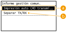 Pulse <On> para imprimir los informes de envío y recepción por separado o <Off> para imprimir ambos informes en una hoja.