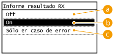 Seleccione esta opción para imprimir un Informe resultado RX solo cuando se produzca un error de recepción.