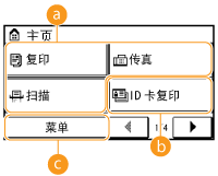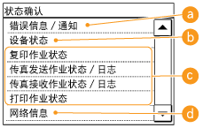 时,将显示可供检查正在打印、发送或接收的文档状态的画面,以及墨粉量等设备状态或本机 IP 地址等网络设置信息。