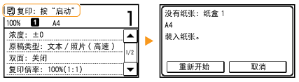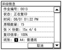 显示所选项目的当前状态。下面以 <复印作业状态> 画面为例进行说明。
