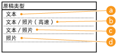 如果选择了 <文本/照片(高速)>、<文本/照片> 或 <照片> 且 <浓度> 已设置为 <自动浓度>,将更改为 <手动浓度>。
