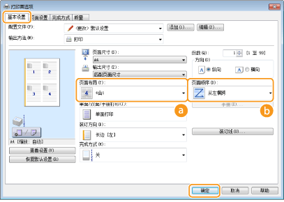 可以将多个页面打印到一页上。例如,通过使用 [4合1] 或 [9合1],可以将四个或九个页面打印到一页上。如果想节约纸张或者以缩略图形式查看文档,请使用此功能。