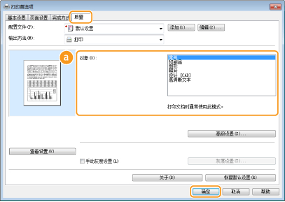 若要为在 [对象] 中选择的每个项目指定详细设置,请单击 [高级设置]。更多信息,请单击打印机驱动程序画面上的 [帮助]。
