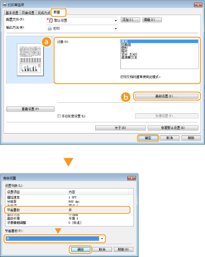 可以指定是否为各文档类型启用墨粉节约设置。为 [对象] 中列出的各文档类型指定墨粉节约设置。