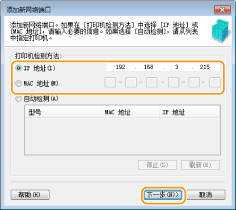 ![]() ![]() 如果未检测到本机 单击 [刷新]。如果问题仍然存在,请单击 [IP 地址] 或 [MAC 地址],输入本机的 IP 地址或 MAC 地址查看网络设置,然后单击 [下一步]。