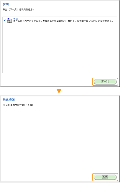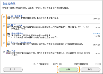 清除除了 [手册] 以外的所有复选框,然后单击 [安装]。