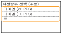 아래 절차에 따라 전화선 유형을 설정합니다. 사용 중인 전화선 유형을 잘 모를 경우 해당 지역 전화국에 문의하십시오. <회선종류 선택>은 기기를 사용하고 있는 국가나 지역에 따라 사용하지 못할 수 있습니다.