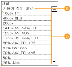 <A5->A4> 등 사전 설정된 복사 배율을 사용하거나 사용자 정의 복사 배율이 1% 단위로 증가하도록 설정하는 방식으로 확대 또는 축소 복사를 할 수 있습니다.