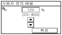 또는 숫자 키를 사용하여 복사 배율을 입력하고 <확정>을 누릅니다. 1% 단위로 25%에서 400%까지 복사 배율을 설정할 수 있습니다.