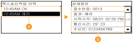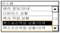 ![]() <팩스송신작업 이력>/<팩스수신작업 이력>송신 및 수신한 문서 목록을 표시합니다. 문서를 성공적으로 송신하거나 수신한 경우 <OK>가 표시되고 취소되거나 에러가 발생하여 문서를 송신하거나 수신하지 못한 경우 <에러>가 표시됩니다.