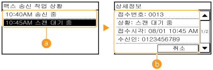 <상세정보>목록에서 선택한 문서에 대한 상세정보를 표시합니다. 여러 수신인을 지정한 경우 화면에 지정한 수신인 수가 표시됩니다. 지정한 여러 수신인의 세부 정보를 확인하려면 <수신인>을 누릅니다. 불필요한 문서가 발견되면 <취소> 또는 <삭제>를 누르고 <예>를 누릅니다.