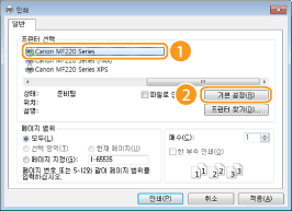 기기의 프린터 드라이버를 선택하고 [기본 설정](또는 [속성])을 클릭합니다.
