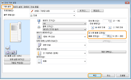 A5에서 A4 등 사전 설정된 인쇄 비율이나 1% 단위로 설정하는 사용자 정의 인쇄 비율을 사용하여 출력물을 확대하거나 축소할 수 있습니다.