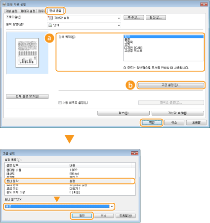 토너 절약 모드를 사용할 경우 가느다란 선과 인쇄 농도가 옅은 부분이 번질 수 있습니다.