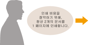프린터 드라이버에서 [1면에 2쪽 인쇄]를 기본 설정으로 지정합니다. 다음 인쇄 작업부터 모든 출력물 페이지는 문서에서 2장씩 인쇄됩니다. 기본 설정 변경