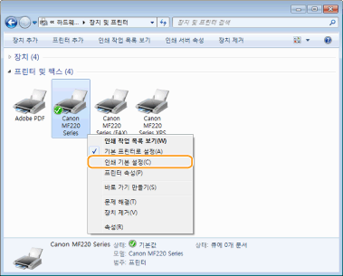 기기의 아이콘을 마우스 오른쪽 버튼으로 클릭하고 [인쇄 기본 설정]을 클릭합니다.
