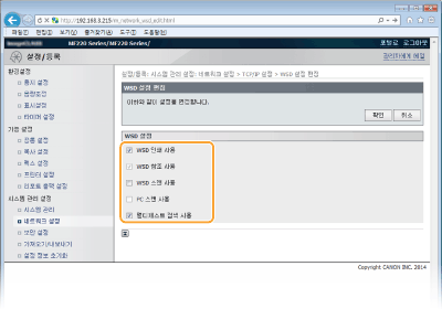 WSD를 통해 인쇄하려면 확인란을 선택합니다. WSD 인쇄를 사용하지 않을 경우 확인란 선택을 해제합니다. [WSD 참조 사용]