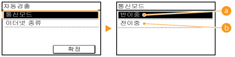 <반이중> 또는 <전이중>을 누릅니다.![]() <반이중>통신 데이터 송수신을 교대로 합니다. 기기가 반이중을 사용하는 네트워크 장치에 연결된 경우에 선택합니다.