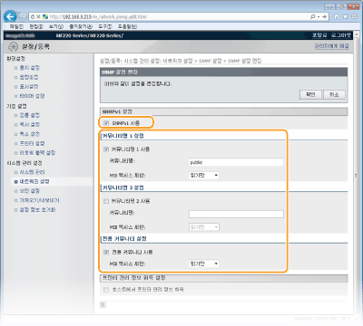 [커뮤니티명 1 사용] 또는 [커뮤니티명 2 사용] 확인란을 선택하고 [커뮤니티명] 텍스트 상자에 커뮤니티명을 입력하고 [MIB 액세스 제한] 설정을 지정합니다.