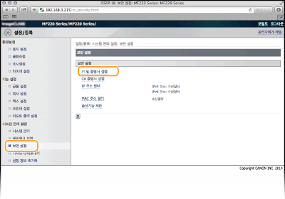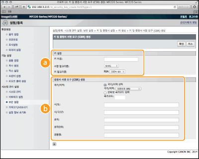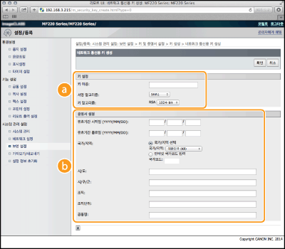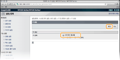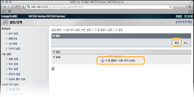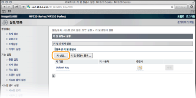 TLS(Transport Layer Security )를 통한 암호화된 통신에 필요한 경우 기기에서 키 쌍을 생성할 수 있습니다. AirPrint를 사용하기 위해 Apple 기기에서 액세스할 때 TLS를 사용할 수 있습니다. 최대 3개의 키 쌍을 기기에 등록할 수 있습니다.