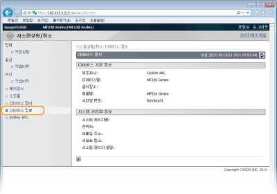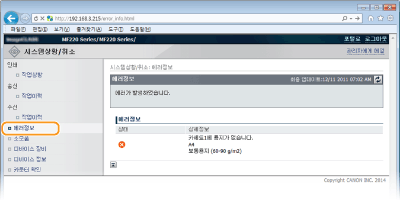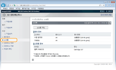 화면에서 <리모트 UI에 소모품 구입 버튼 표시>를 <설정>으로 설정하십시오. 시스템 관리 설정