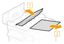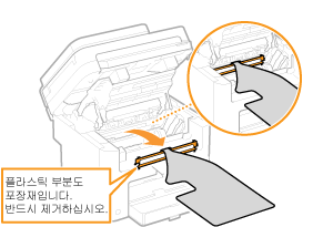 걸린 용지를 기기에서 무리하게 제거하지 마십시오.용지를 무리하게 제거하면 부품이 손상될 수 있습니다. 용지를 제거할 수 없으면 지역 공인 Canon 대리점이나 Canon 서비스 센터에 문의하십시오.