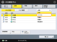 送信ジョブが複数あるときに(ストップ)を押すと、中止対象の送信ジョブが画面に表示されます。中止したい送信ジョブが表示されていないときに<他のジョブを確認>を押すと<送信ジョブ一覧>が表示されます。中止したい送信ジョブを選択し、<中止>を押してください。