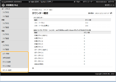 エラー情報、用紙やトナーの残量、装着されているオプション情報、今までに印刷された文書の合計ページ数など、本機のさまざまな情報を確認することができます。
