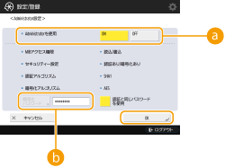3 | 必要な設定をして、<OK>を押す ![]() <Administratorを使用>Administratorを使用する場合は<ON>を押します。 <暗号化パスワード>認証と異なるパスワードを使用する場合は、<認証と同じパスワードを使用>の選択を解除し、<暗号化パスワード>を押してパスワードを入力します。 ![]() 管理者「Administrator」を無効にしている場合は、<Administrator設定>を設定することはできません(<Administratorを使用>の設定は<OFF>で固定されます)。 |