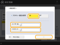 <認証設定>プロキシーサーバーの認証機能を使用するときに押して認証情報を設定します。表示される画面で<ON>を押し、プロキシー認証で使用するユーザー名とパスワードを入力したあと、<OK>を押します。