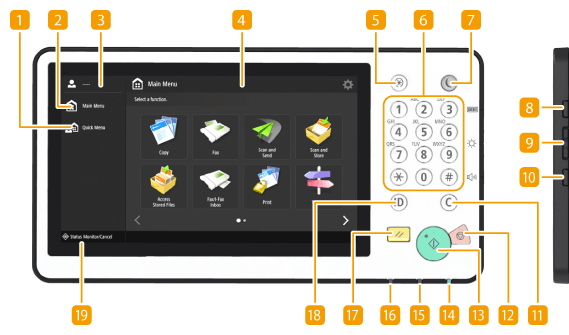 Press to check the status of printing or faxing, or to view the usage history. You can also check the status of the machine, such as the remaining amount of paper and toner, or whether any errors occurred.