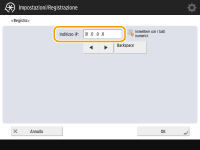 Per confermare le informazioni delle stampanti multifunzione Canon registrate, selezionare la macchina dall'elenco del passo 3 e premere <Dettagli>. Per cancellare una stampante multifunzione Canon registrata, selezionare la macchina dall'elenco e premere <Elimina> <Sì>.Numero massimo di periferiche registrabili come periferica remota: 7 Per collegare direttamente la macchina e la fotocopiatrice a cascata tramite un cavo incrociato, occorre specificare le impostazioni seguenti per <Impostazioni driver Ethernet>. <Impostazioni driver Ethernet> <Rilevazione automatica>: <On> <Modo di comunicazione>: <Full Duplex> <Tipo di Ethernet>: <100BASE-TX> |