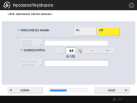 Specificare le impostazioni per la connessione di rete. ![]() ![]() Premere <On> per <Utilizzo IPv4> o <Utilizzo IPv6> e premere <Avanti>. Inoltre, è possibile utilizzare sia IPv4 che IPv6. Se si preme <Off> per <Utilizzo IPv4> e <Utilizzo IPv6>, quindi si preme <OK>, saltare le impostazioni di rete e passare alla Fase 10. ![]() Se si preme <On> per <Utilizzo IPv4>, specificare le seguenti impostazioni. ![]() Per ottenere automaticamente l'indirizzo IP, premere <DHCP> o <IP autom.> e premere <Avanti> o <OK>. Per impostare l'indirizzo IP manualmente, cancellare la selezione di <DHCP> o <IP autom.>, premere <Indirizzo IP>, <Subnet mask> e <Indirizzo gateway> per inserire ciascun valore e premere <Avanti> o <OK>. Per ulteriori informazioni sulle impostazioni dell'indirizzo IPV4, vedere Impostazione di un indirizzo IPv4. ![]() Se si preme <On> per <Utilizzo IPv6>, specificare le seguenti impostazioni. ![]() Premere <On> per utilizzare l'indirizzo stateless oppure <Off> per non utilizzarlo e premere <Avanti>. Per ulteriori informazioni sull'indirizzo IPv6, vedere Impostazione di un indirizzo IPv6. ![]() Dopo aver specificato l'indirizzo stateless, specificare le seguenti impostazioni. ![]() Premere <On> per utilizzare l'indirizzo manuale oppure <Off> per non utilizzarlo e premere <Avanti>. Per utilizzare l'indirizzo manuale, premere <Indirizzo manuale>, <Lunghezza prefisso> e <Indiriz. router predefinito> per inserire ciascun valore. ![]() Dopo aver specificato l'indirizzo manuale, specificare le seguenti impostazioni. ![]() Premere <On> per utilizzare DHCPv6 o <Off> per non utilizzare DHCPv6 e premere <OK>. | |