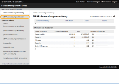 Sie können die Anzahl der installierten Anwendungen sowie den verwendeten Festplattenspeicher überprüfen. Verwalten der MEAP-Anwendungen