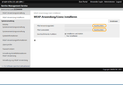 Nach dem Erwerb der Lizenzdatei rufen Sie SMS über das Remote UI auf, um eine MEAP-Anwendung zu installieren.