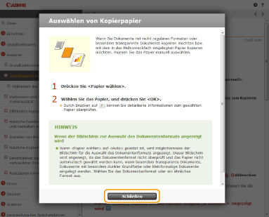 Wenn Sie auf das Symbol klicken, wird möglicherweise die aktuelle Seite abgedunkelt, und ein Popup-Fenster erscheint. Um zu der Seite zurückzukehren, klicken Sie auf [Schließen] im Popup-Fenster.