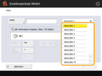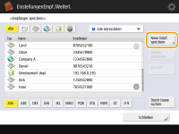 Wenn bereits ein LDAP-Server im Gerät registriert wurde (Registrieren des LDAP-Servers), können Sie nach Zielen suchen und diese im Adressbuch registrieren. Drücken Sie <Einstellungen Empf./Weiterl.> <Empfänger speichern> <Neue Empf. speichern> <Vom LDAP-Server speichern>, um mit <Durch Beding.such.> oder <Durch Name suchen> nach Zielen zu suchen.Wenn das Suchergebnis leer ist, obwohl der Benutzername und das Passwort richtig sind, prüfen Sie die Zeiteinstellungen des LDAP-Servers und des Systems. Falls die Zeiteinstellung zwischen dem LDAP-Server und dem System um fünf Minuten oder mehr abweicht, kann keine Suche durchgeführt werden. Wenn mehrere Ziele in den Suchergebnissen angezeigt werden, können Sie bis zu 256 dieser Adressen gleichzeitig registrieren. Die Informationen, die über den LDAP-Server abgerufen werden können, bestehen nur aus Namen und Faxnummern/Adressen. Registrieren Sie bei Bedarf weitere Informationen aus <Details/Bearbeiten>. Sie können nicht gleichzeitig über das Bedienfeld und die Remote UI nach Zielen auf einem LDAP-Server suchen. Bei der Suche nach Zielen auf einem LDAP-Server über das Bedienfeld des Gerätes können Sie vier Suchbedingungen angeben. Andererseits können Sie bei der Suche nach Zielen auf einem LDAP-Server über die Remote-Oberfläche nur eine Suchbedingung angeben. Sie müssen möglicherweise den Benutzernamen und das Passwort angeben. Geben Sie den Benutzernamen und das Passwort des Geräts ein, das auf dem LDAP-Server registriert ist. Wenn keine Authentifizierungsinformationen verwendet werden, suchen Sie, indem Sie die Felder für den Benutzernamen und das Passwort in der Remote UI leer lassen. Festlegen/Registrieren von Empfängern aus dem VersandverlaufSie können Empfänger im Adressbuch über den Versandverlauf im <Statusmonitor/Abbruch>-Bildschirm festlegen und registrieren. Hiermit sparen Sie sich den Aufwand, die Adresse direkt einzugeben. Sie vermeiden somit auch den Versand aufgrund der Eingabe des falschen Ziels an die falsche Adresse. Bei der Festlegung eines Empfängers: <Statusmonitor/Abbruch> <Senden> <Auftragslog> Wählen Sie den Empfänger, an den gesendet werden soll <Als SendeEmpf. festl.> <OK>Bei der Registrierung eines Empfängers: <Statusmonitor/Abbruch> <Senden> <Auftragslog> Registrieren Sie den Empfänger auf dem Registrierungsbildschirm für jeden Zieltyp |