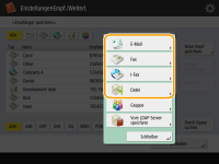 ![]() | Sie können die Faxnummer oder die E-Mail-Adresse eines Empfängers im Adressbuch registrieren und gescannte Dokumente ins Adressbuch senden. Außerdem können Sie eine I-Fax-Adresse, ein Dateiserver-Ordnerverzeichnis (IP-Adresse und Pfad) und den Speicherplatz (Erweiterter Platz) eines Canon-Multifunktionsdruckers* als Ziel im Adressbuch registrieren. * Verfügbar nur für die imageRUNNER ADVANCE Serie. |