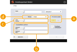 1 | Legen Sie Einstellungen nach Bedarf fest. ![]() <Per Server senden>Legen Sie fest, ob I-Faxnachrichten über den Mailserver gesendet werden sollen. Wählen Sie <Ein>, wenn Sie I-Faxe über den Mailserver senden möchten. Wählen Sie <Aus>, wenn Sie Daten direkt an einen Empfänger in demselben LAN senden möchten. Durch das direkte Senden an einen Empfänger können Sie große Datenmengen senden, ohne den Mailserver zu belasten. ![]() Um ein I-Fax, das kein IP-Adressformat wie beispielsweise "Benutzername@[IP-Adresse des Empfängers]" aufweist, ohne Verwendung eines Mailservers zu senden, müssen Einstellungen wie beispielsweise ein MX (Mail eXchange)-Eintrag auf dem DNS-Server konfiguriert sein. Fragen Sie den Netzwerkadministrator, ob diese Art von Einstellung verfügbar ist. Wenn Sie <Aus> in <Per Server senden> einstellen, müssen Sie zuvor <Ein> in <Senden> <Per Server senden verwenden> einstellen. Wenn diese Einstellung <Aus> ist, kann die Einstellung in <Per Server senden> nicht geändert werden. Es wird empfohlen, <Senden> <MDN nicht per Server zulassen> to <Ein> zu setzen.Auch wenn Sie <Per Server senden> auf <Aus> einstellen, wird die Rückmeldung für Dokumente, die im Vollmodus gesendet wurden, über den Server vorgenommen. <Standardfelder speichern>Diese Einstellung ist für die Verwendung eines Internetfaxdienstes erforderlich. Wenn Sie keinen Internetfaxdienst verwenden, ist diese Einstellung nicht erforderlich. Weitere Informationen dazu erhalten Sie bei Ihrem Internetanbieter. <I-Fax-Adresse>Geben Sie die I-Faxadressen im folgenden Format ein: adv01@example.com. Verwenden Sie beim Senden an einen Empfänger in demselben Netzwerk das folgende Format: adv01@[192.168.11.100] (Gerätename des Empfängers@[IP-Adresse]). Wenn die zu verwendende Domäne fest eingestellt ist, können Sie die Domäneneingabe überspringen. Sie können einen Domänennamen in <Def. Domän auto. an Empf.ohne Domän hinzufügen> registrieren und <Bei Senden eines I-Fax> im Voraus aktivieren, um beim Senden automatisch eine Domäne hinzuzufügen, ohne dass Sie "@" und den Domänennamen eingeben müssen. Sie können häufig verwendete Domänennamen unter <Gespeicherte Zeichen> auf der Tastatur speichern und sie erneut aufrufen, wenn Sie eine I-Faxadresse eingeben. <Gespeicherte Zeichen für Tastatur> <Modus:>Sie können den Typ der Sendeergebnisse auswählen, die angezeigt werden, wenn (Statusmonitor/Abbruch) gedrückt wird. Wählen Sie <Voll>, wenn Sie prüfen möchten, ob ein I-Fax an das Gerät des Empfängers zugestellt wurde, oder wählen Sie <Einfach>, wenn Sie prüfen möchten, ob ein I-Fax an einen Mailserver zugestellt wird. Beachten Sie, dass Sie den Zustellungsstatus nicht überprüfen können, wenn das Gerät des Empfängers die Funktion <Modus:> nicht unterstützt.![]() Wenn Sie ein I-Fax im Modus <Voll> an ein Gerät senden, das den Modus <Voll> nicht unterstützt, wird selbst nach abgeschlossener Übertragung <Auf Ergeb. warten...> angezeigt, wenn Sie den Zustellungsstatus durch Drücken von (Statusmonitor/Abbruch) überprüfen. Diese Meldung wird angezeigt, bis die in <Senden> <SE Timeout für Vollmodus> festgelegte Zeit vergangen ist.Sie können den Status der Zustellung überprüfen, indem Sie (Statusmonitor/Abbruch) <Senden> <Auftragslog> drücken. Wenn das Dokument erfolgreich gesendet wurde, wird <OK> angezeigt, wenn es nicht gesendet werden konnte, wird <NG> angezeigt, und wenn das Ergebnis nicht überprüft werden kann, wird <--> angezeigt. Im einfachen Modus ist die Zustellbestätigung deaktiviert, und es wird <--> auch bei einer erfolgreichen Zustellung angezeigt. |