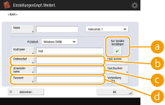 1 | Geben Sie den Hostnamen des Dateiservers/Erweiterter Platz ein, der die Daten überträgt. ![]() Fragen Sie den Netzwerkadministrator nach den Informationen des Dateiservers/Erweiterter Platz. <Protokoll>Wählen Sie eine der folgenden Optionen als Protokoll für den Dateiserver: <Windows (SMB)>, <FTP> oder <WebDAV>. Beim Senden eines Dokuments an Erweiterter Platz wählen Sie <Windows (SMB)> oder <WebDAV>. ![]() Wenn Sie <Windows (SMB)> auswählen, werden die Tasten <Host suchen> und <Durchsuchen> angezeigt. Sie können einen Dateiserver/Erweiterter Platz einfach angeben, indem Sie das Netzwerk durchsuchen oder anzeigen. Sie können bis zu fünf Verzeichnisserver registrieren, die in <Durchsuchen> verwendet werden. <Hostname>Geben Sie den Hostnamen des Dateiservers/Erweiterter Platz ein. Wenn Sie <FTP> als Protokoll auswählen, muss der <Hostname> wie folgt eingegeben werden. Wenn TLS deaktiviert ist Beispiel: Um im gemeinsam genutzten Speicherplatz zu speichern: ftp://host name/share Um im persönlichen Speicherplatz zu speichern: ftp://host name/users Wenn TLS aktiviert ist Beispiel: Um im gemeinsam genutzten Speicherplatz zu speichern: ftps://host name/share Um im persönlichen Speicherplatz zu speichern: ftps://host name/users Beim Senden eines Dokuments an Erweiterter Platz geben Sie den <Hostname> wie folgt ein. Wenn Sie <Windows (SMB)> für das Protokoll auswählen Beispiel: Um im Shared Space zu speichern: \\192.168.100.50\share Um im persönlichen Speicherplatz zu speichern: \\192.168.100.50\users Wenn Sie <WebDAV> für Protokoll auswählen Wenn TLS deaktiviert ist Beispiel: Um im gemeinsam genutzten Speicherplatz zu speichern: http://<IP-Adresse oder Hostname> Um im persönlichen Speicherplatz zu speichern: http://<IP-Adresse oder Hostname> Wenn TLS aktiviert ist Beispiel: Um im gemeinsam genutzten Speicherplatz zu speichern: https://<IP-Adresse oder Hostname> Um im persönlichen Speicherplatz zu speichern: https://<IP-Adresse oder Hostname> <Verbindung prüfen>Drücken Sie diese Schaltfläche nach der Eingabe des Hostnamens, um die Verbindung zum Dateiserver/Erweiterter Platz zu bestätigen. ![]() Wenn Sie einen Anmeldeservice, wie z. B. die persönliche Authentifizierungsverwaltung, verwenden, müssen Sie <Anwendername> und <Passwort> eingeben. |