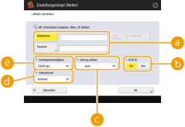 2 | Drücken Sie <Details einstellen>, und legen Sie die gewünschten Einstellungen fest. ![]() <Subadresse>/<Passwort>Legen Sie beim Senden oder Empfangen von Dokumenten höhere Sicherheit fest, indem Sie eine Unteradresse und ein Passwort zu allen Faxtransaktionen hinzufügen. Grundfunktionen für das Senden von Faxnachrichten <ECM SE>Wählen Sie <Ein>, um Bildfehler zu korrigieren. Wählen Sie <Aus>, wenn das Faxgerät des Empfängers kein ECM (Error Correction Mode) unterstützt. ![]() Um Faxdokumente mit ECM zu senden, müssen Sie <Einstellungen Fax> <ECM SE> auf <Ein> festlegen. <Leitung wählen>Wenn Sie über weitere Telefonleitungen verfügen, können Sie die zum Senden einer Faxnachricht zu verwendende Leitung auswählen. <International>Wenn bei Anrufen ins Ausland häufig Übertragungsfehler auftreten, wählen Sie <International (1)>. Wenn weiterhin Fehler auftreten, ändern Sie die Einstellung in <International (2)> oder <International (3)>. <Sendegeschwindigkeit>Je nach Gerät des Empfängers oder Leitungsstatus kann ein Übertragungsfehler wegen der Übertragungsgeschwindigkeit auftreten. Wenn häufig Fehler auftreten, legen Sie einen niedrigeren Wert für diese Einstellung fest. ![]() Sie können zwar Elemente in der Faxeinstellung festlegen (Anzeige für Grundeigenschaften des Faxens), es bietet sich aber an, diese hier festzulegen, wenn Sie die Sendebedingungen für die einzelnen Ziele ändern möchten. Legen Sie <Kommun.geschw. bei Verwend. von VoIP auto justier.> auf <Ein> fest, um Faxdokumente besser empfangen und senden zu können, wenn die Leitung oder die Gegenseite häufig Fehler verursacht. Wenn Sie diese Option auf <Ein> festlegen, ist die Kommunikationsgeschwindigkeit auf höchstens 14.400 bps begrenzt, wodurch sich Fehler verringern lassen. |