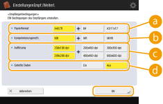 2 | Drücken Sie <Empfängerbedingungen> legen Sie die einzelnen Einstellungen fest, und drücken Sie <OK>.![]() <Papierformat>Legen Sie das Papierformat fest, das der Empfänger empfangen kann. Überprüfen Sie, bevor Sie diese Einstellung vornehmen, ob das Papierformat der zu sendenden Daten zu den Spezifikationen des Empfangsgeräts passt. <A4/LTR>: Es wird im Format A4/LTR gesendet. <A4/LTR> + <B4>: Es wird im Format A4/LTR oder B4 gesendet. <A4/LTR> + <A3/11x17>: Es wird im Format A4/LTR oder A3/11" x 17" gesendet. <A4/LTR> + <B4> + <A3/11x17>: Es wird im Format A4/LTR, B4 oder A3/11" x 17" gesendet. ![]() Ist das Papierformat der gescannten Daten kleiner als die in <Papierformat> festgelegten Formate, so werden die Daten mit dem kleinsten in <Papierformat> festgelegten Format gesendet. Die Ränder bleiben frei. Ist das Papierformat der gescannten Daten größer als die in <Papierformat> festgelegten Formate, so werden die Daten verkleinert und mit dem größten in <Papierformat> festgelegten Format gesendet. Definieren Sie die Bedingungen des Ziels passend zu den Spezifikationen des Empfängergerätes. Ist das Papierformat der zu sendenden Daten größer als die Papierformate, die mit dem Gerät des Empfängers verwendet werden können, so wird das Bild möglicherweise beschnitten oder abgeschnitten. <Komprimierungsmeth.>Wählen Sie die Komprimierungsmethode aus. Die Komprimierungsrate ist am höchsten für MMR, gefolgt von MR und schließlich MH. Je höher die Komprimierungsrate, desto kürzer ist die Übertragungszeit. <Auflösung>Wählen Sie einen höheren Wert, um die Auflösung und die Bildqualität zu steigern. Mit einer höheren Auflösung steigt jedoch die Übertragungszeit. <Geteilte Daten>Wenn die gesendete Datenmenge den Höchstwert überschreitet (<Maximale Datengröße zum Senden>), legen Sie fest, ob die Daten nach Größe oder nach Seite aufgeteilt werden sollen. Wenn Sie <Ein> auswählen, werden die Daten in kleinere Mengen aufgeteilt, die unter dem Grenzwert liegen, und in mehreren Teilen gesendet. Das Gerät des Empfängers muss in der Lage sein, die empfangenen Daten zu kombinieren. Wenn Sie <Aus> in <Per Server senden> ( ) in Schritt 1 zum Konfigurieren der I-Fax-Einstellung festlegen, werden die Daten ohne Aufteilung gesendet, selbst wenn sie den Höchstwert überschreiten.![]() Definieren Sie die Empfängerbedingungen passend zu den Spezifikationen des Empfangssystems. Beim Einstellen von Bedingungen, die das Empfangssystem nicht erfüllen kann, können Übertragungsfehler auftreten. |