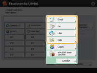 ![]() | Es bietet sich an, ein häufig verwendetes Ziel in einer Zielwahl-Schaltfläche zu registrieren. So können Sie ein Ziel schnell durch Drücken einer Schaltfläche angeben. Sie können in Zielwahl-Schaltflächen nicht nur Faxnummern oder E-Mail-Adressen, sondern auch Dateiserververzeichnisse (IP-Adresse und Pfad) registrieren, um gescannte Daten zu speichern. |