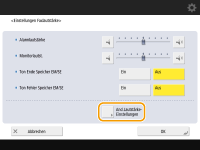 <Alarmlautstärke>Passen Sie die Lautstärke des Tons an, der ausgegeben wird, wenn eine Faxübertragung abgebrochen wird oder wenn der Druck einer empfangenen Faxnachricht abgeschlossen ist. Wenn kein Ton ausgegeben werden soll, drücken Sie ganz links auf