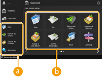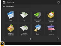 Schaltflächen, die die Grundfunktionen des Geräts aufrufen, sind hier aufgeführt. Wenn es einige Schaltflächen gibt, die nicht auf einen Bildschirm passen, drücken Sie