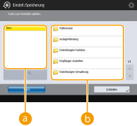 (Einstellungen/Speicherung), um den Bildschirm <Einstell./Speicherung> anzuzeigen. Drücken Sie zuerst diese Taste, um Änderungen für die jeweilige Einstellung vorzunehmen, wie beispielsweise Papiereinstellungen, Anzeigeeinstellungen und Netzwerkeinstellungen. Auf diesem Bildschirm können Sie auch Ziele registrieren, wie E-Mail-Adressen und Faxnummern.