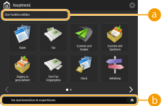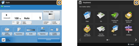 Drücken Sie  , das im Hauptmenü und auf dem Grundfunktionsbildschirm angezeigt wird, um den Bildschirm anzupassen, das heißt, um Tasten neu anzuordnen oder eine Schnelltaste anzulegen. Das Hauptmenüdisplay kann nur von einem Administrator angepasst werden. Anpassen des SensordisplaysSie können die Einstellungen im Bezug auf die Bildschirmanzeige ändern, wie beispielsweise der Bildschirm, der unmittelbar nach Einschalten des Geräts angezeigt wird, und ob die Meldung für verbleibende Papier- und Tonermenge erscheint. <Einstellungen Anzeige> |
