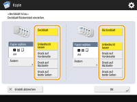 Um ein Deckblatt hinzuzufügen, drücken Sie <Deckblatt>. Beim Kopieren auf das Deckblatt können Sie festlegen, ob auf der Vorderseite, der Rückseite oder auf beiden Seiten kopiert werden soll.