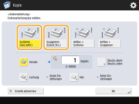 ![]() | Wenn Sie zwei oder mehr Kopien über die Zufuhr kopieren, können Sie die Sortierung oder Gruppierung für die Reihenfolge der Ausdrucke auswählen. Wählen Sie "Sortieren", um die Sätze mit aufeinanderfolgenden Seiten zu drucken. Wählen Sie "Gruppieren", um jede Seite gebündelt zu drucken (also 10 Blätter für die erste Seite, 10 Blätter für die zweite Seite usw.). |
