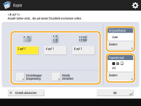 Um doppelseitige Kopien zu erstellen bzw. doppelseitige Originale für einseitige Kopien zu scannen, drücken Sie <Einstellungen Doppelseitig>. Weitere Informationen zu dieser Einstellung finden Sie im Abschnitt "Doppelseitiges Kopieren" in Schritt 4 unter